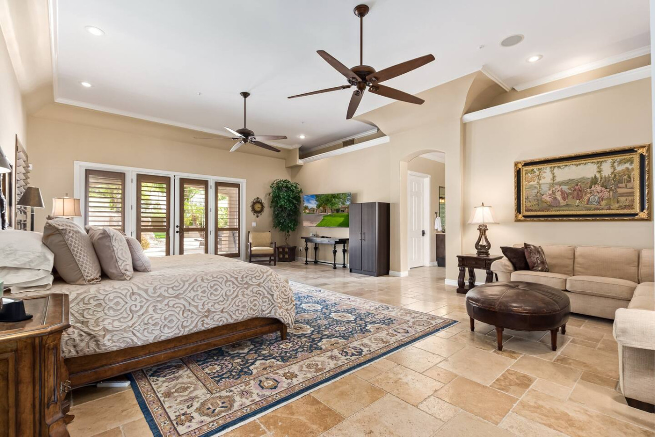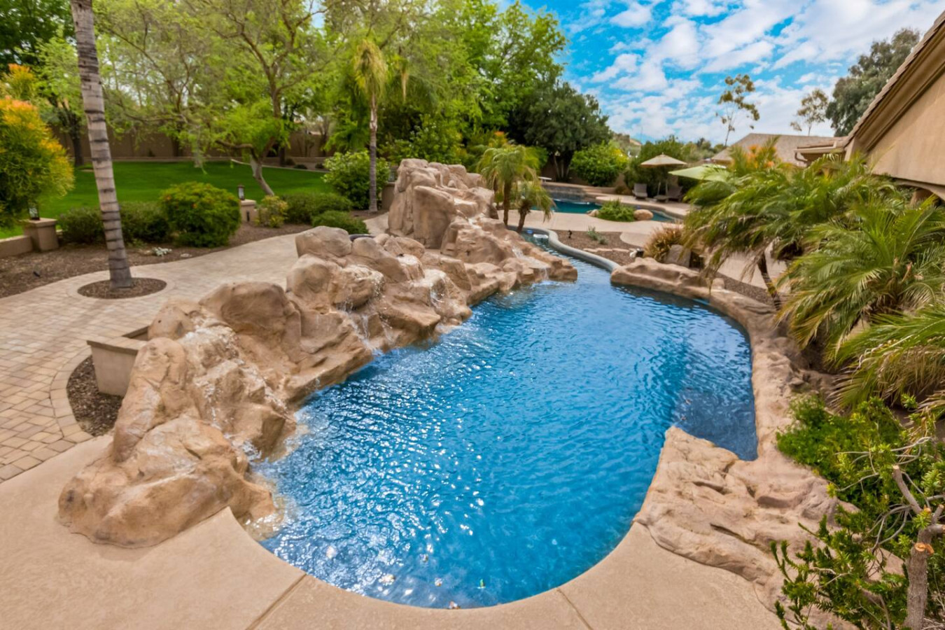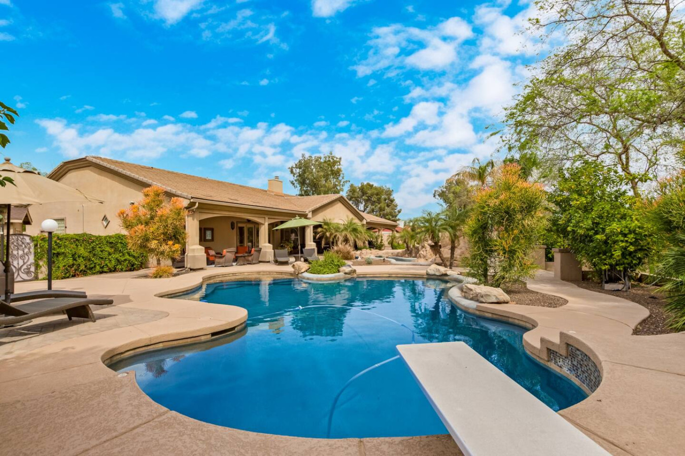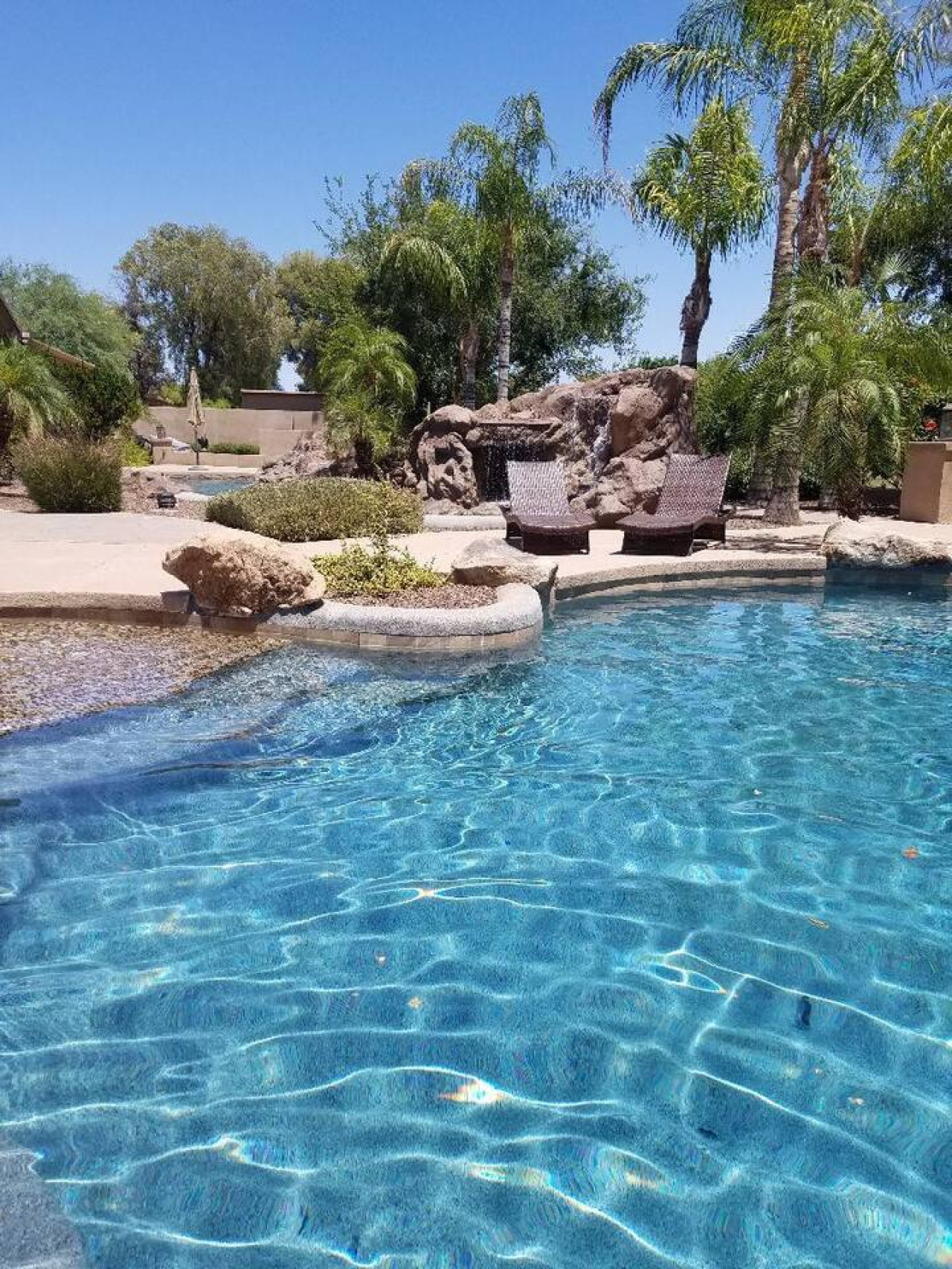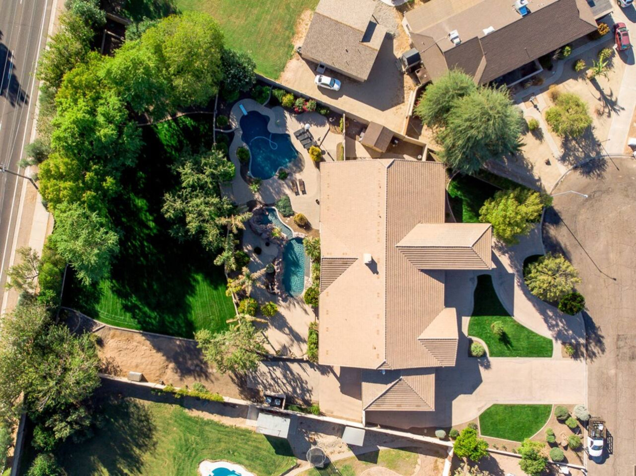 Bring the whole family for lots of fun. Heated diving pool and a non heated play pool with waterfalls and lazy river for the littles. Weddings/events available for an additional fee. Located on one grassy acre in town. 5 spacious bedrooms, 3 king beds, 2 queens W temperpedic mattress and TV in every room. House is 5,000sf, Savant music is piped throughout the property, 3 trane units for your total comfort. R/O water, 2 ovens & refrigerators, laundry room and garage. Plus More!