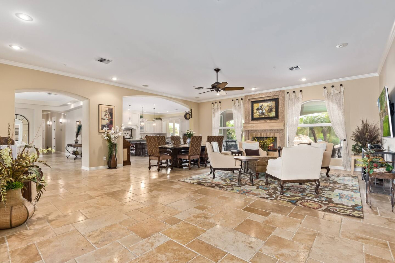 Bring the whole family for lots of fun. Heated diving pool and a non heated play pool with waterfalls and lazy river for the littles. Weddings/events available for an additional fee. Located on one grassy acre in town. 5 spacious bedrooms, 3 king beds, 2 queens W temperpedic mattress and TV in every room. House is 5,000sf, Savant music is piped throughout the property, 3 trane units for your total comfort. R/O water, 2 ovens & refrigerators, laundry room and garage. Plus More!