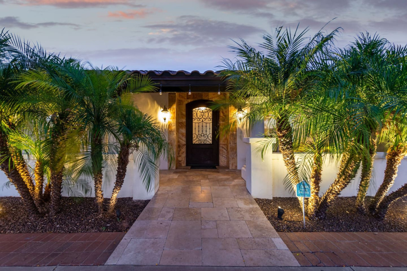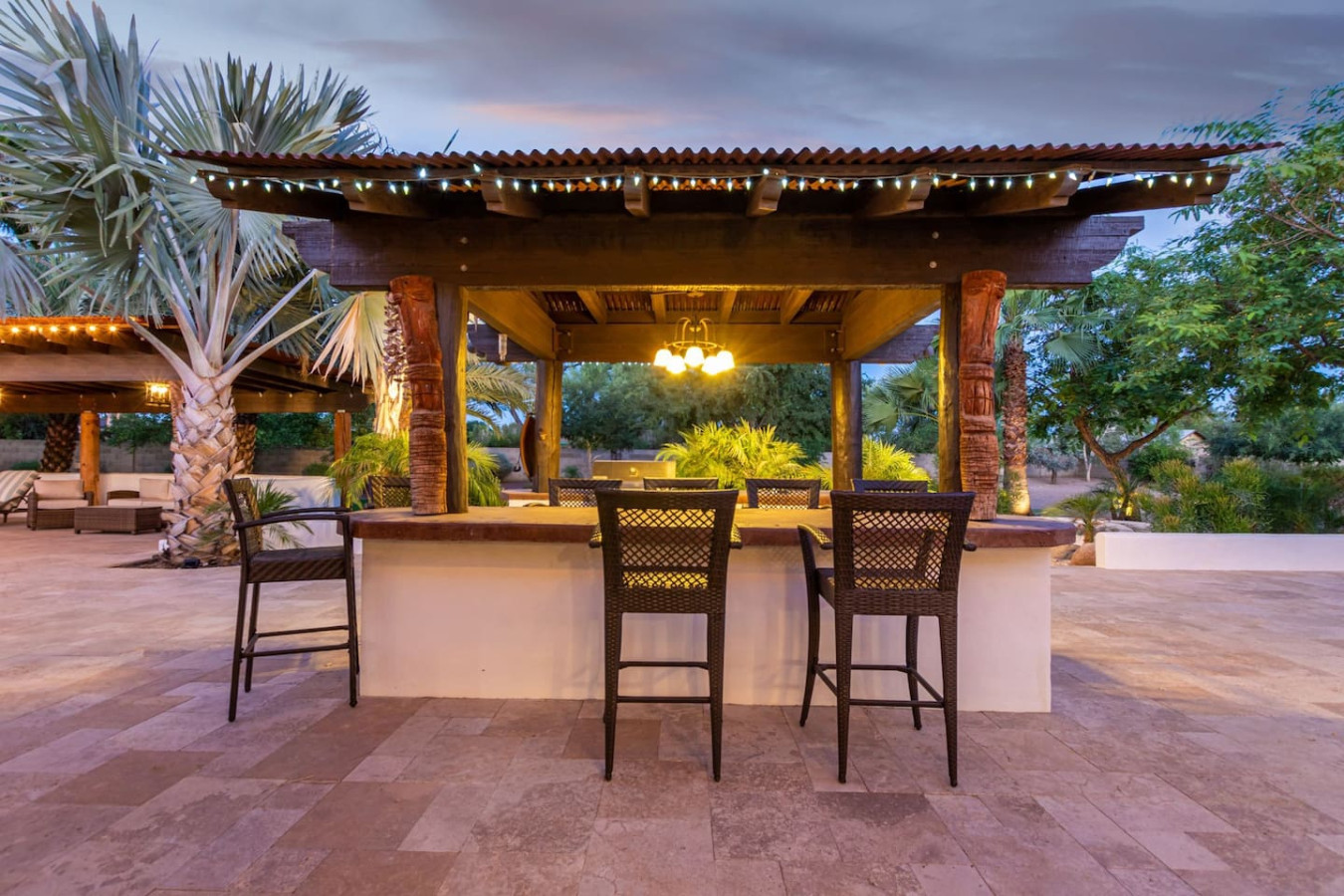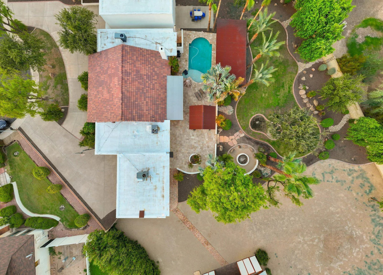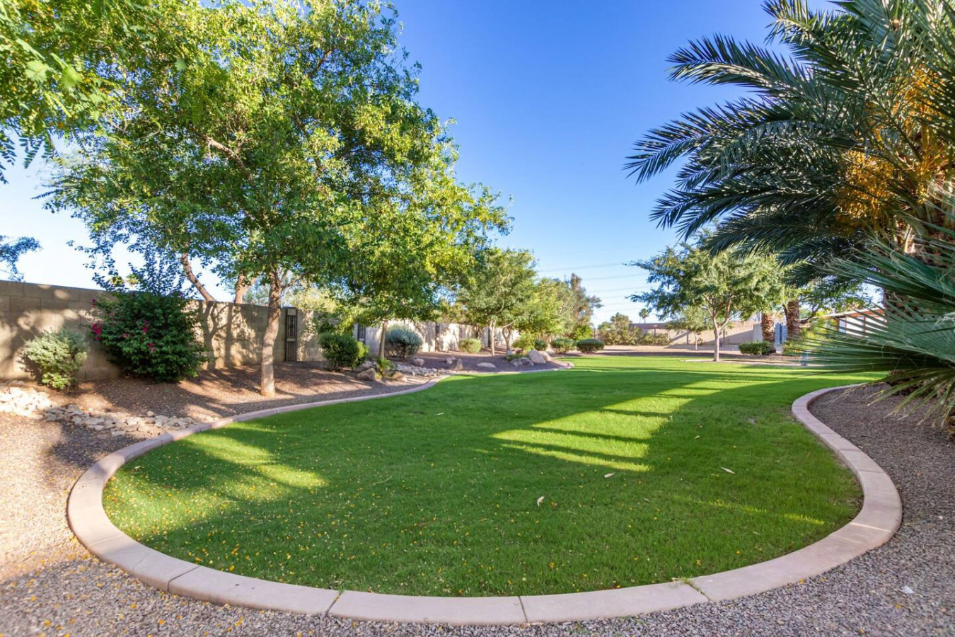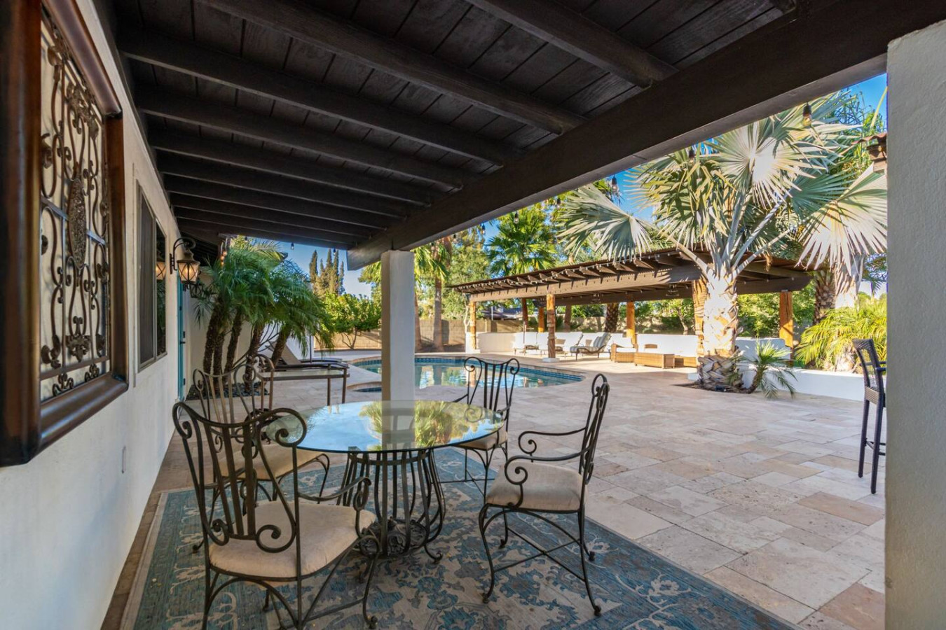 Game room features foosball, ping pong, pacman arcade game table and corn hole. Pool can be heated and covered to keep warm Nestled in a neighborhood of one acre properties just 4 miles from Peoria Sports Complex that hosts Spring Training for Seattle Mariners and San Diego Padres. 99 Palms offers a tranquil setting for your sunny Arizona vacation stay. Events may be approved with special consideration. City of Glendale noise ordinance requires quiet hours be observed 9pm to 7am. There are 5 bedrooms, 2 king beds, 4 queen beds. The house has a den with a 65 inch Smart TV loaded with streaming choices like Netflix, apple + and Disney +. There are 5 Sonos music speakers you can move around the property and listen to sonos radio, Pandora music or stream from your own phone once you connect to 99 Palms WiFi. Each bedroom has a smart TV, there is a 50 inch portable TV for outdoor use located in the game room. This TV can be moved around the property to enjoy while swimming, playing games, using the BBQ or hosting a meal in the barn. There are pool toys located in the storage bin by the pool and in the hall cabinet leading to the garage. The baja shelf is very large and can house 2 umbrellas to shade swimmers from the sun. Umbrellas are located behind the sofa under the Ramada. The ramada is a great place to hang out and there are 2 outdoor dining tables with seating for 10 plus 4 bar stools under the 2nd ramada. This is a great place for entertaining. Room for dancing on the pavers or in the barn. Quiet hours are 9pm to 7 am so all activities need to move indoors at that time. The game room is temperature controlled. There are 3 HVAC systems that run this home. Guests access the entire house with game room and the patio with 2 ramadas is accessible to guests. There is a barn and a large parking area in the gravel area behind the barn for extra vehicles. There is room to park 5 cars in the front driveway and truck and trailers can park in the back. The only areas not accessible to guests is the RV garage which stores host's personal items. I am always available via text or phone. I have a great support team that ensures your comfort should issues arise. If you prefer me to meet you upon check in, this can be easily arranged. Long horn ranch is a quiet neighborhood of one acres lots. There is lots of parking, in the front, in the garage or behind the RV gate. I request to know beforehand if you would prefer to use garage for parking vehicles or as a game room so I may set a/c accordingly. Pool is heated. There is an extra charge in winter months. There are security cameras on property exterior only.