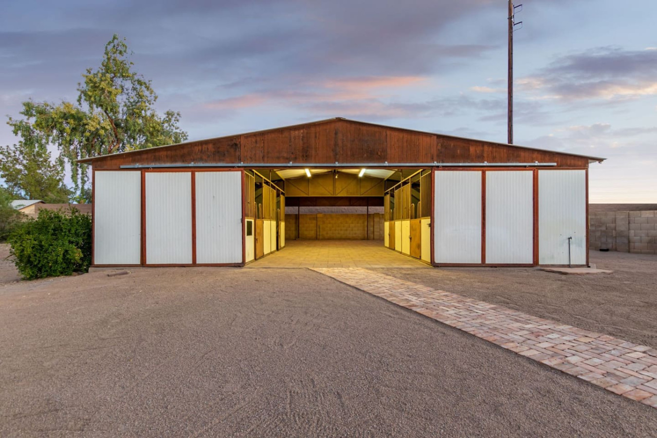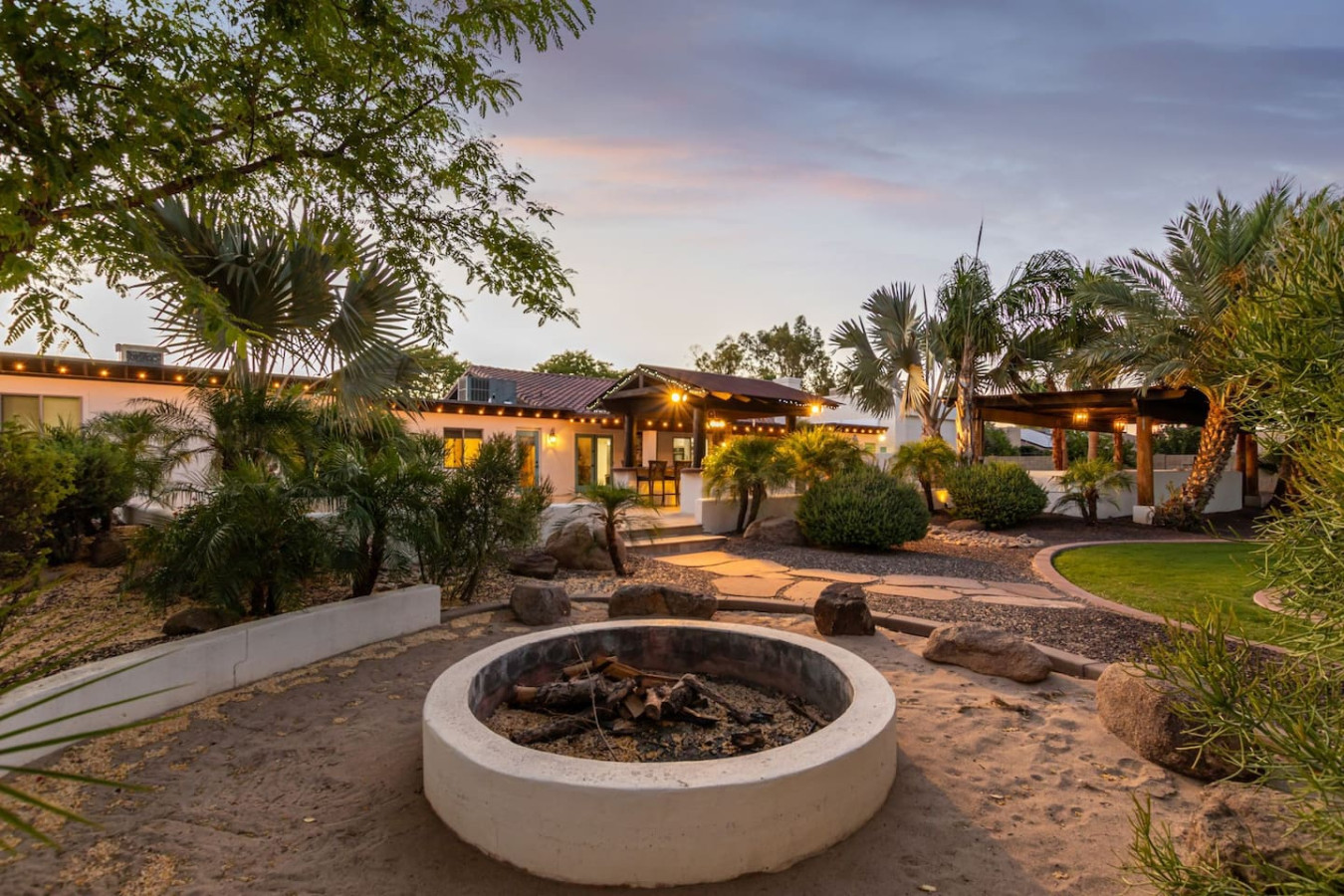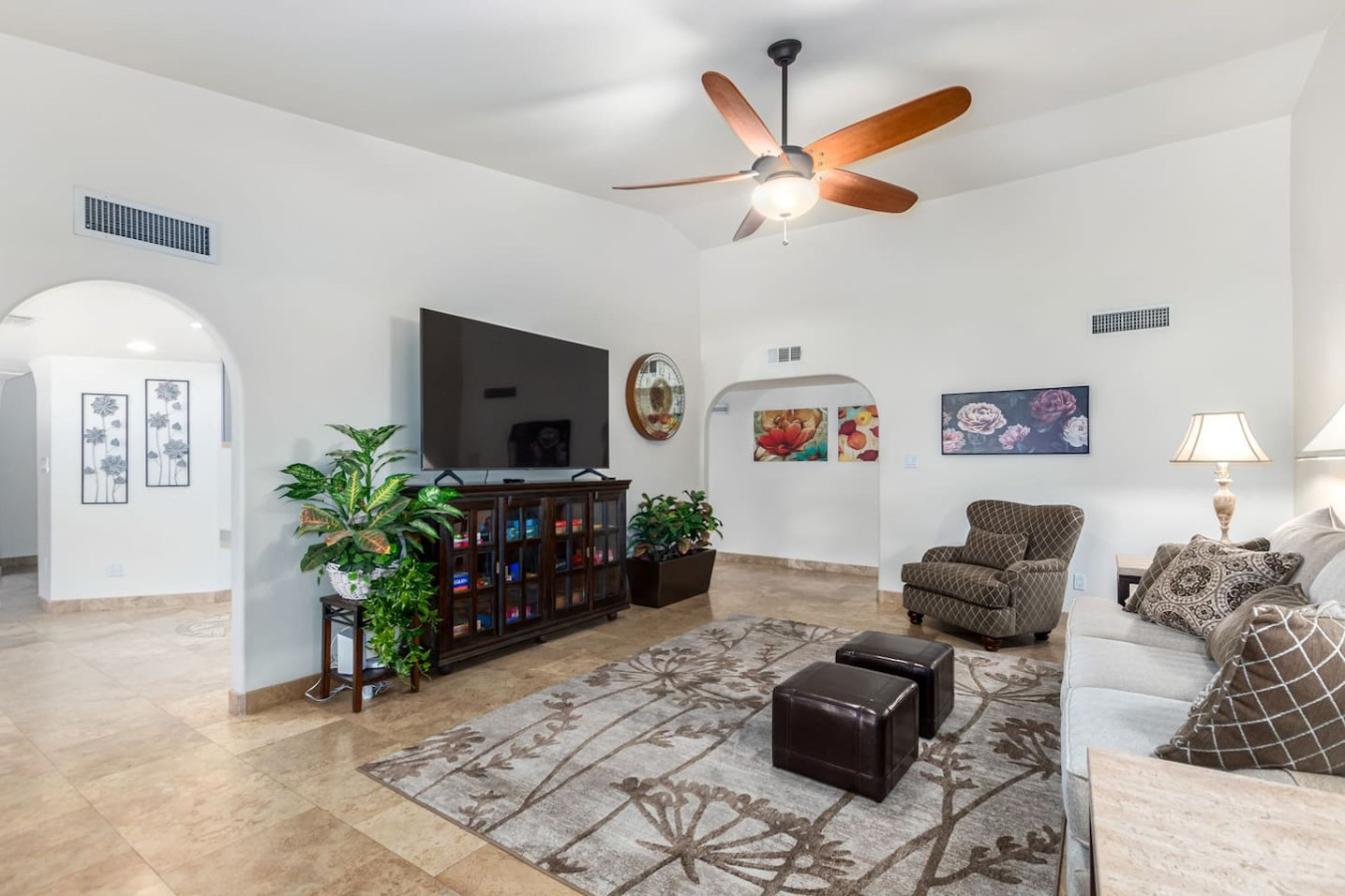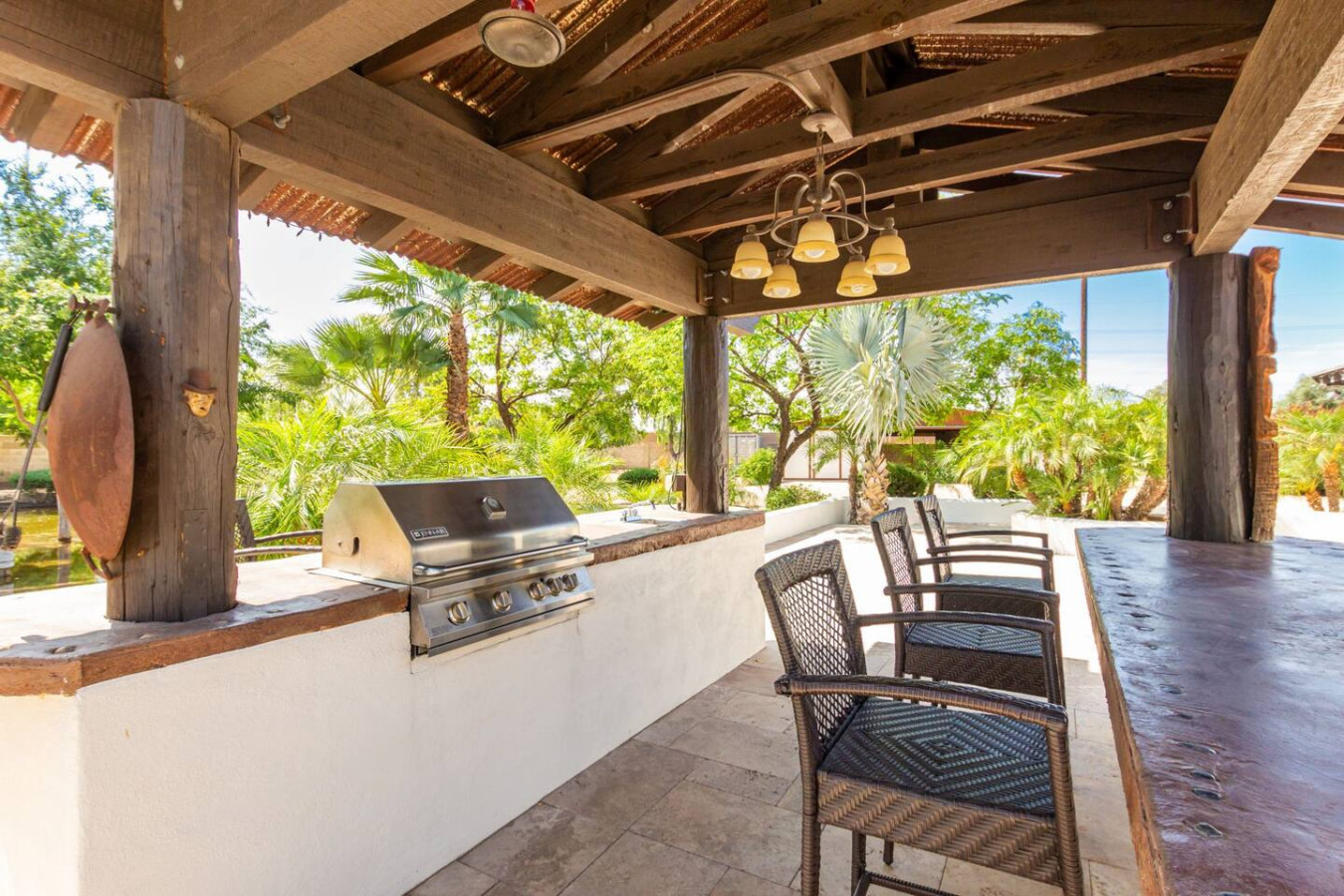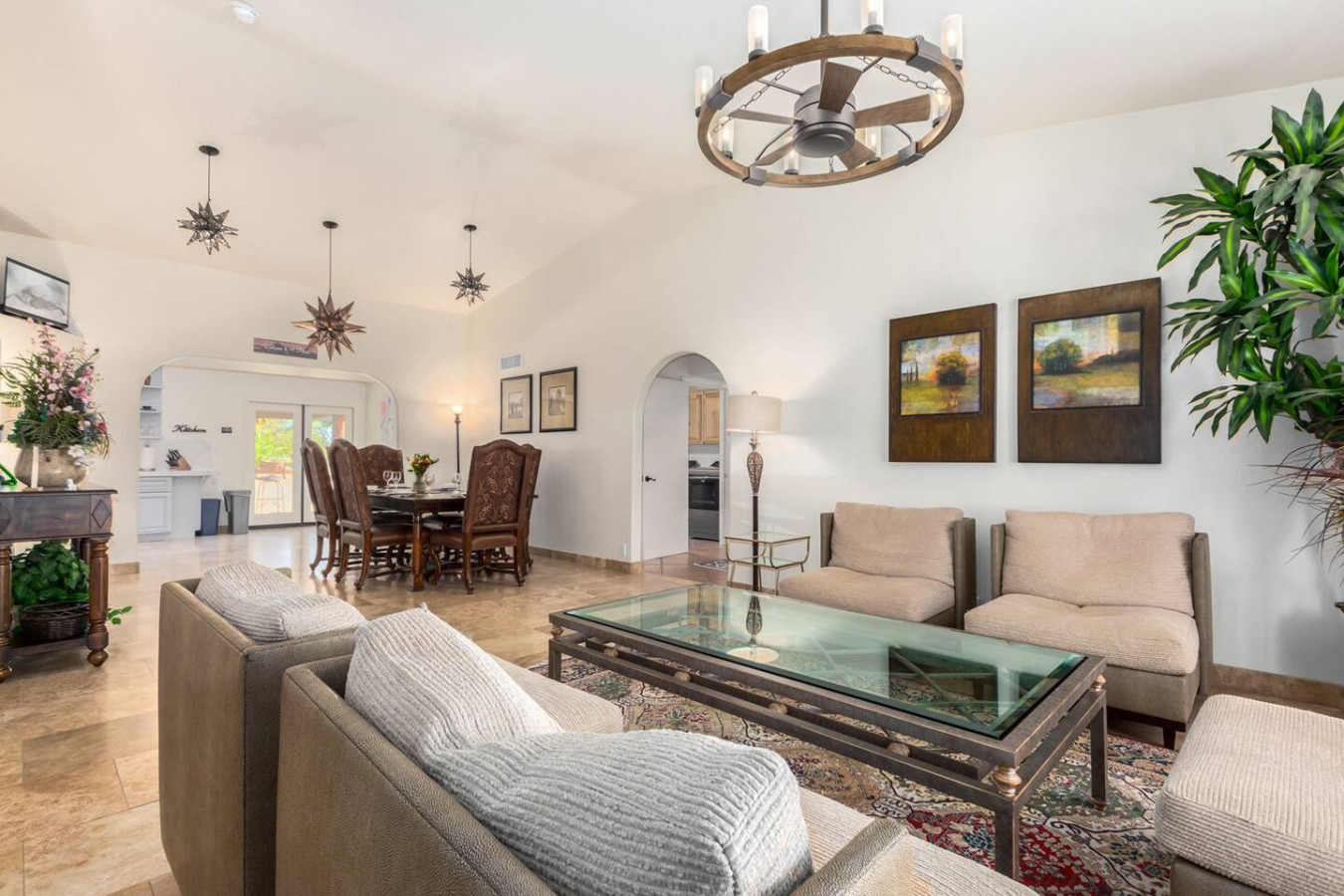Game room features foosball, ping pong, pacman arcade game table and corn hole. Pool can be heated and covered to keep warm Nestled in a neighborhood of one acre properties just 4 miles from Peoria Sports Complex that hosts Spring Training for Seattle Mariners and San Diego Padres. 99 Palms offers a tranquil setting for your sunny Arizona vacation stay. Events may be approved with special consideration. City of Glendale noise ordinance requires quiet hours be observed 9pm to 7am. There are 5 bedrooms, 2 king beds, 4 queen beds. The house has a den with a 65 inch Smart TV loaded with streaming choices like Netflix, apple + and Disney +. There are 5 Sonos music speakers you can move around the property and listen to sonos radio, Pandora music or stream from your own phone once you connect to 99 Palms WiFi. Each bedroom has a smart TV, there is a 50 inch portable TV for outdoor use located in the game room. This TV can be moved around the property to enjoy while swimming, playing games, using the BBQ or hosting a meal in the barn. There are pool toys located in the storage bin by the pool and in the hall cabinet leading to the garage. The baja shelf is very large and can house 2 umbrellas to shade swimmers from the sun. Umbrellas are located behind the sofa under the Ramada. The ramada is a great place to hang out and there are 2 outdoor dining tables with seating for 10 plus 4 bar stools under the 2nd ramada. This is a great place for entertaining. Room for dancing on the pavers or in the barn. Quiet hours are 9pm to 7 am so all activities need to move indoors at that time. The game room is temperature controlled. There are 3 HVAC systems that run this home. Guests access the entire house with game room and the patio with 2 ramadas is accessible to guests. There is a barn and a large parking area in the gravel area behind the barn for extra vehicles. There is room to park 5 cars in the front driveway and truck and trailers can park in the back. The only areas not accessible to guests is the RV garage which stores host's personal items. I am always available via text or phone. I have a great support team that ensures your comfort should issues arise. If you prefer me to meet you upon check in, this can be easily arranged. Long horn ranch is a quiet neighborhood of one acres lots. There is lots of parking, in the front, in the garage or behind the RV gate. I request to know beforehand if you would prefer to use garage for parking vehicles or as a game room so I may set a/c accordingly. Pool is heated. There is an extra charge in winter months. There are security cameras on property exterior only.