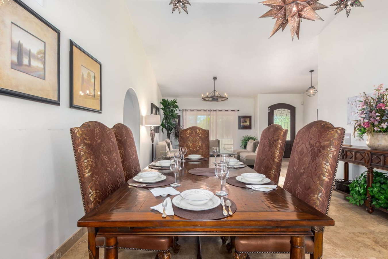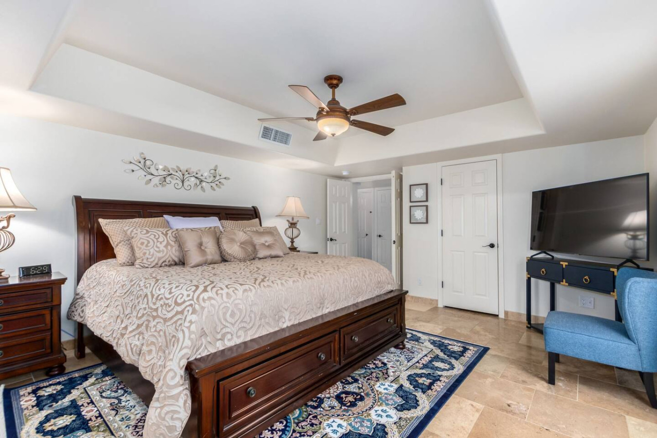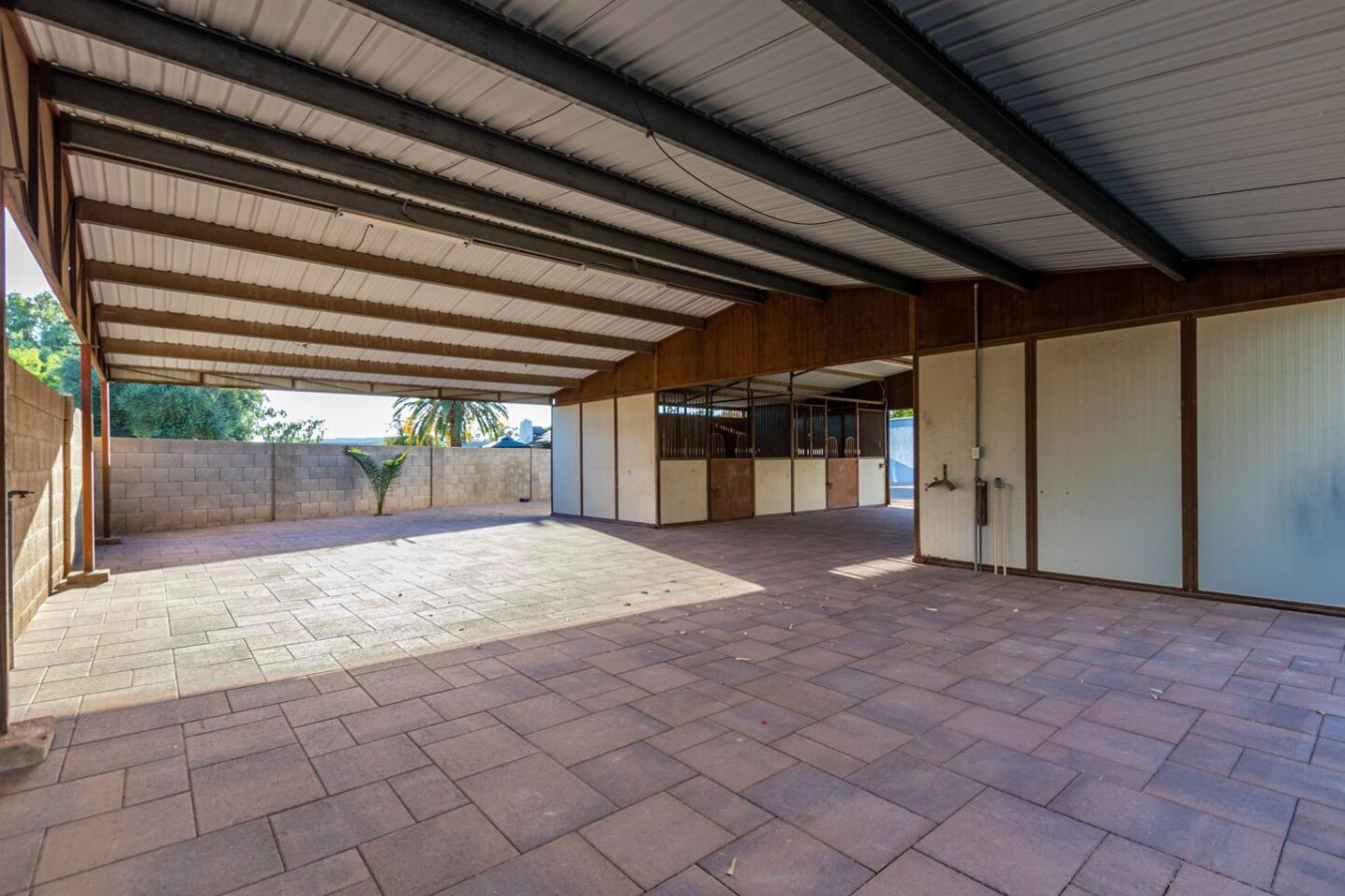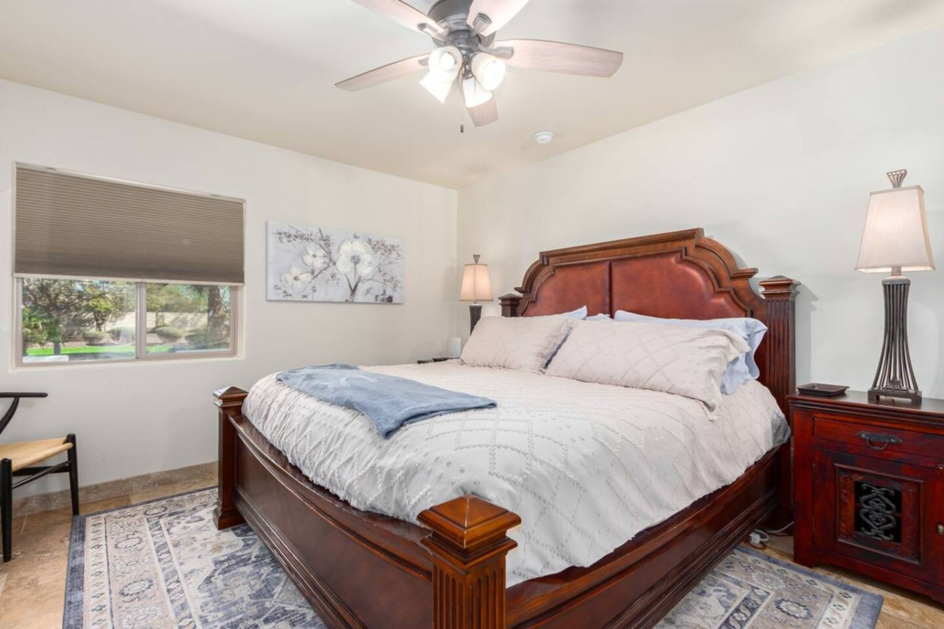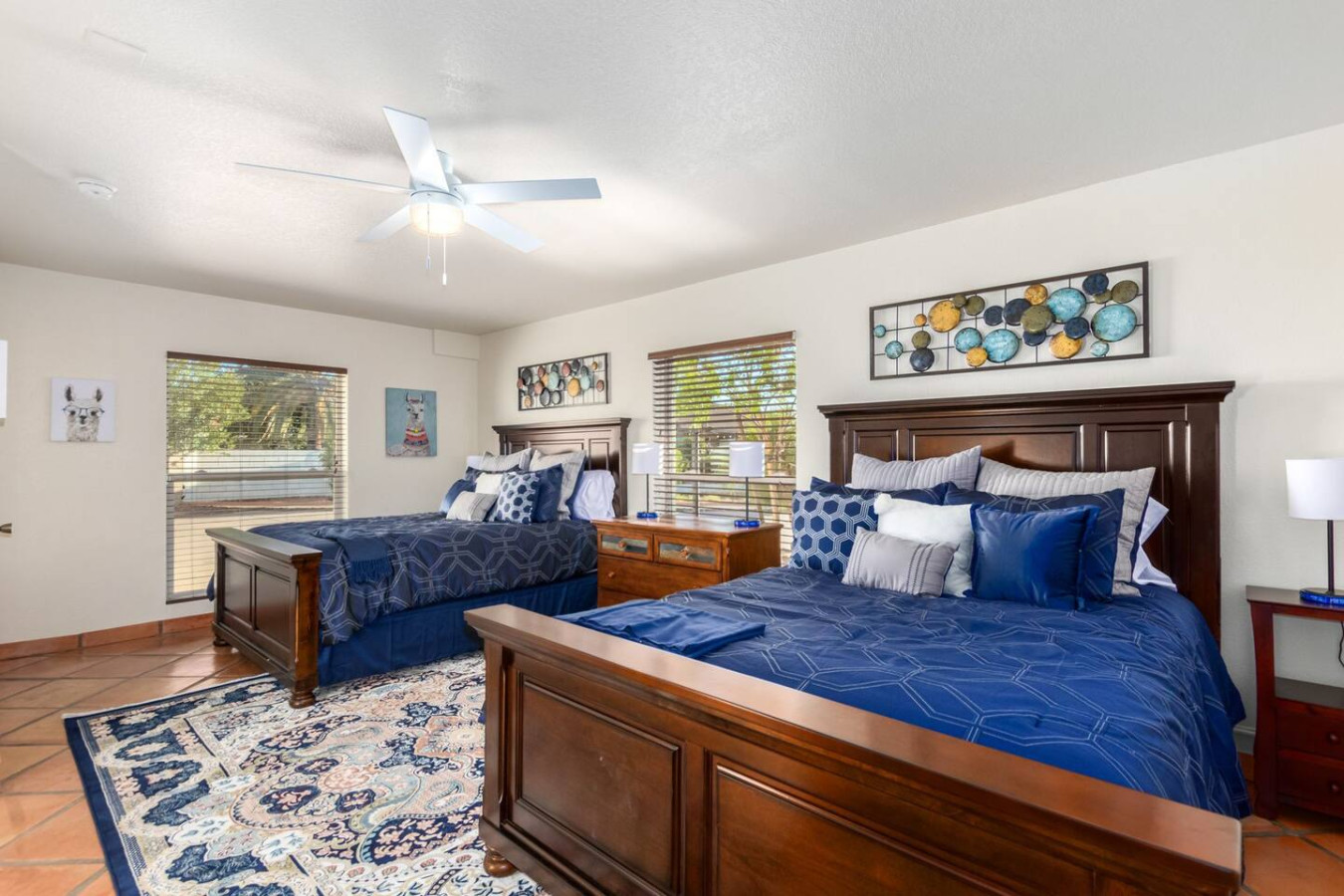 Game room features foosball, ping pong, pacman arcade game table and corn hole. Pool can be heated and covered to keep warm Nestled in a neighborhood of one acre properties just 4 miles from Peoria Sports Complex that hosts Spring Training for Seattle Mariners and San Diego Padres. 99 Palms offers a tranquil setting for your sunny Arizona vacation stay. Events may be approved with special consideration. City of Glendale noise ordinance requires quiet hours be observed 9pm to 7am. There are 5 bedrooms, 2 king beds, 4 queen beds. The house has a den with a 65 inch Smart TV loaded with streaming choices like Netflix, apple + and Disney +. There are 5 Sonos music speakers you can move around the property and listen to sonos radio, Pandora music or stream from your own phone once you connect to 99 Palms WiFi. Each bedroom has a smart TV, there is a 50 inch portable TV for outdoor use located in the game room. This TV can be moved around the property to enjoy while swimming, playing games, using the BBQ or hosting a meal in the barn. There are pool toys located in the storage bin by the pool and in the hall cabinet leading to the garage. The baja shelf is very large and can house 2 umbrellas to shade swimmers from the sun. Umbrellas are located behind the sofa under the Ramada. The ramada is a great place to hang out and there are 2 outdoor dining tables with seating for 10 plus 4 bar stools under the 2nd ramada. This is a great place for entertaining. Room for dancing on the pavers or in the barn. Quiet hours are 9pm to 7 am so all activities need to move indoors at that time. The game room is temperature controlled. There are 3 HVAC systems that run this home. Guests access the entire house with game room and the patio with 2 ramadas is accessible to guests. There is a barn and a large parking area in the gravel area behind the barn for extra vehicles. There is room to park 5 cars in the front driveway and truck and trailers can park in the back. The only areas not accessible to guests is the RV garage which stores host's personal items. I am always available via text or phone. I have a great support team that ensures your comfort should issues arise. If you prefer me to meet you upon check in, this can be easily arranged. Long horn ranch is a quiet neighborhood of one acres lots. There is lots of parking, in the front, in the garage or behind the RV gate. I request to know beforehand if you would prefer to use garage for parking vehicles or as a game room so I may set a/c accordingly. Pool is heated. There is an extra charge in winter months. There are security cameras on property exterior only.